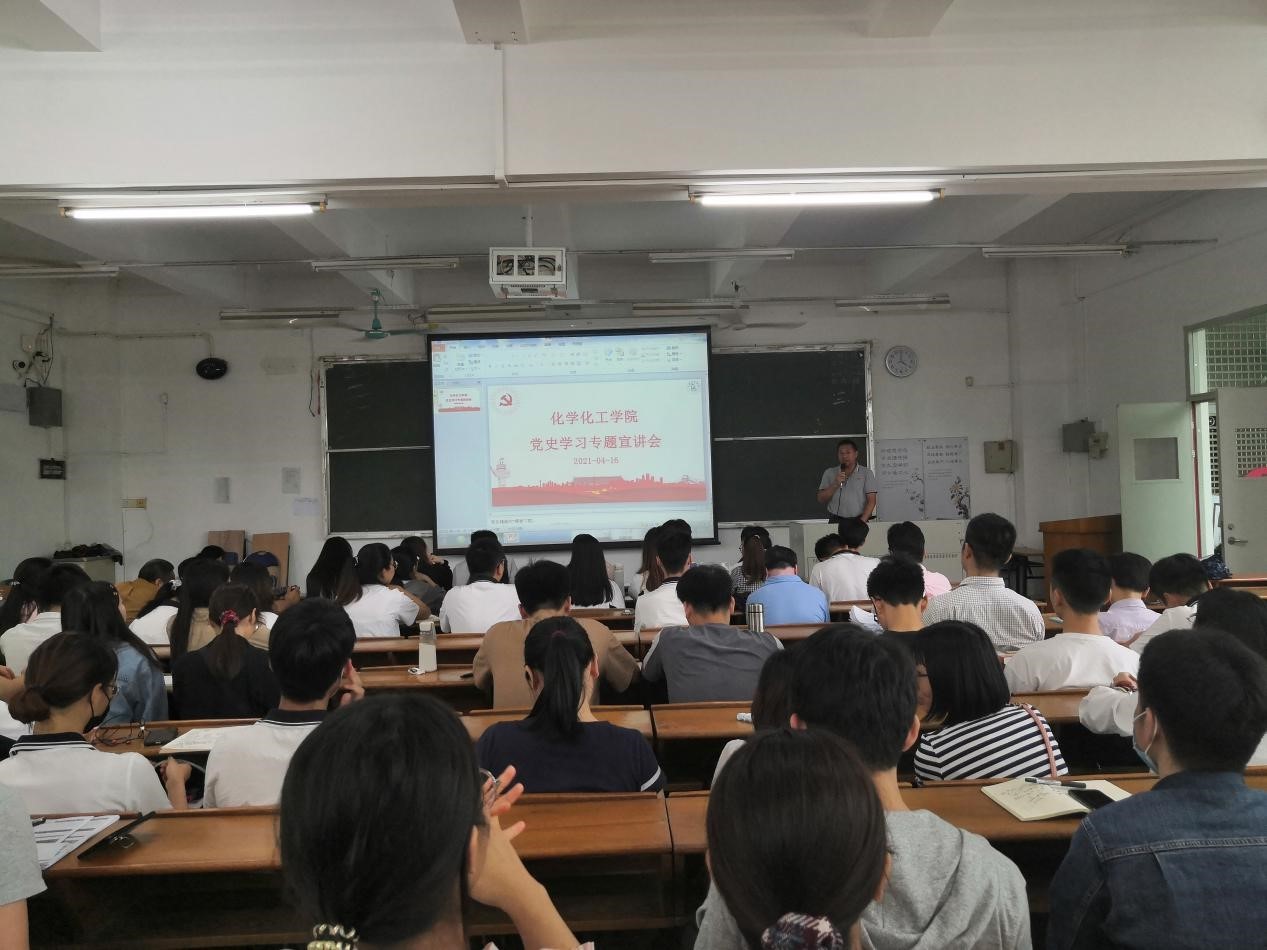 为深入学习贯彻落实习近平总书记在党史学习教育动员大会上的重要讲话精神,严格落实在全党开展党史学习教育,4月16日下午,化学化工学院党总支邀请学校党委委员、党史专家唐明勇,在海珠校区教学楼B601课室开展了党史学习教育专题宣讲会。宣讲会由学院党总支书记邱树华主持,全院师生党员参加了本次宣讲会。