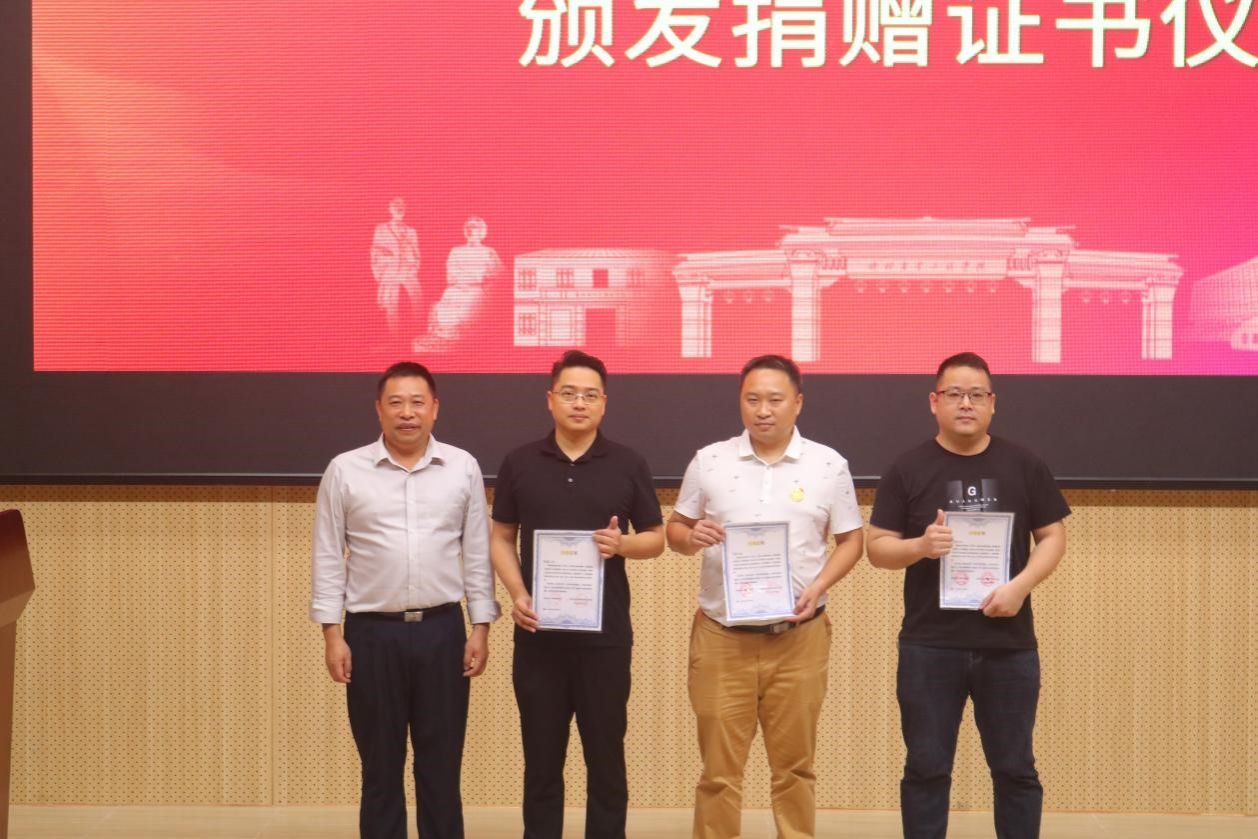 为感谢校友捐赠文化墙名人挂画,学院领导班子为捐赠物资的叶帝水、欧阳丽花、李金成、陈剑勇等校友代表颁发捐赠证书。